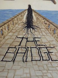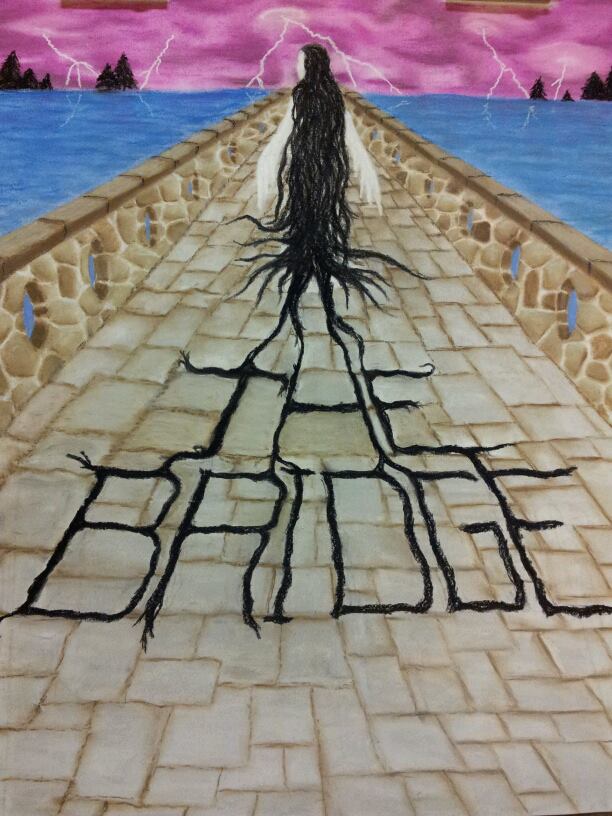 At this point I found myself at a loss as to what to put in for the background in the distance. Again I drew upon the story itself and added a storm and some shadowy trees which surround the bridge on all sides.